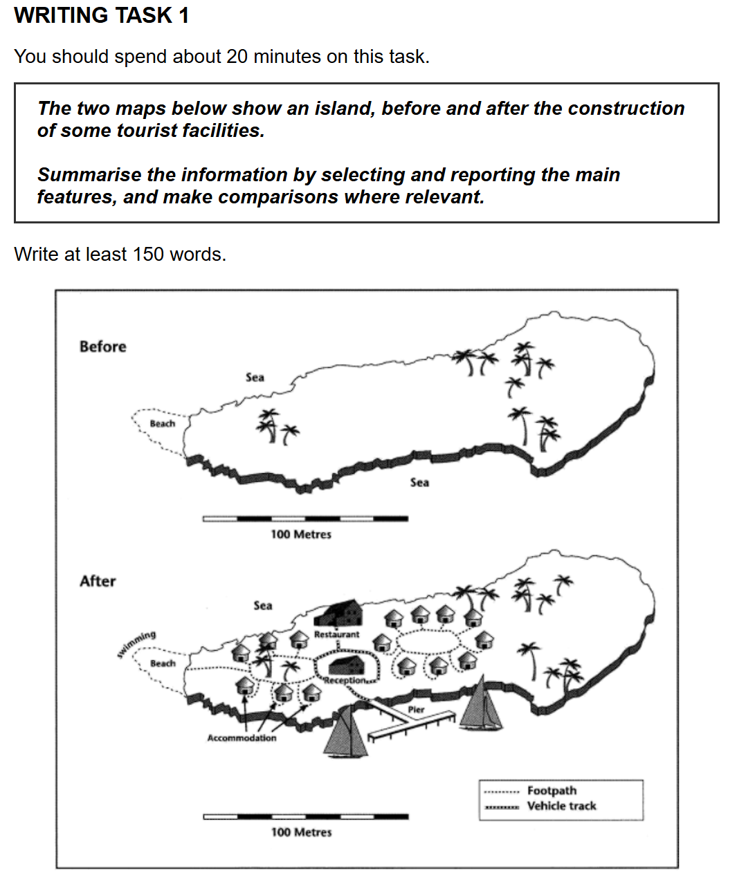 写作任务回顾: The two maps below show an island, before and after the construction of some tourist facilities. Summarise the information by selecting and reporting the main features, and make comparisons where relevant. Write at least 150 words.