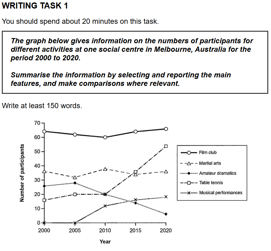 The provided line graph illustrates the numbers of participants for different activities at one social centre in Melbourne, Australia, from 2000 to 2020. | The line graph illustrates the number of participants in five different activities at a social centre in Melbourne, Australia, over a 20-year period from 2000 to 2020. | 优化: 1. provided 是多余的,可以直接删掉。2. numbers 通常用单数 the number of ,这是一个固定搭配。3. 将 for different activities 具体化为 in five different activities ,将 from 2000 to 2020 丰富为 over a 20-year period from 2000 to 2020 ,能体现更强的概括能力。 |