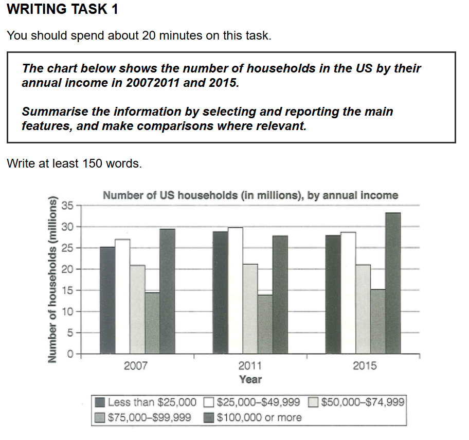 The provided bar chart compares the number of households in the US by income per year in three years, 2007, 2011, and 2015. | The provided bar chart illustrates the number of US households (in millions) across five different annual income brackets for the years 2007, 2011, and 2015. | 优化表达: compares...by income per year in three years 有些啰嗦。illustrates...across five different annual income brackets for the years... 表达更精确、更地道。 |