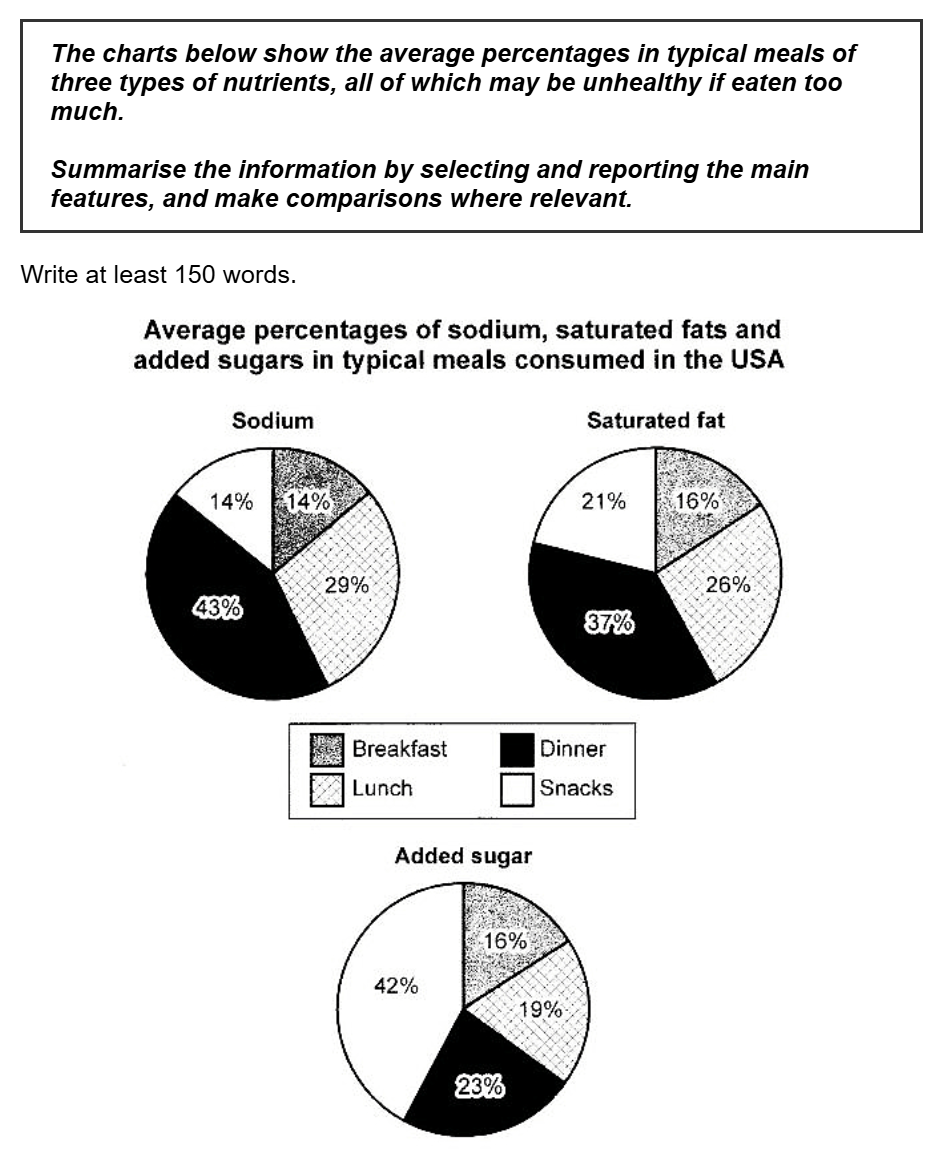 审题 (Analyze the prompt): 我会看懂图表。这是三张饼图,展示了美国人在四种餐(早、午、晚、零食)中,三种不健康营养素(钠、饱和脂肪、添加糖)的摄入百分比。
