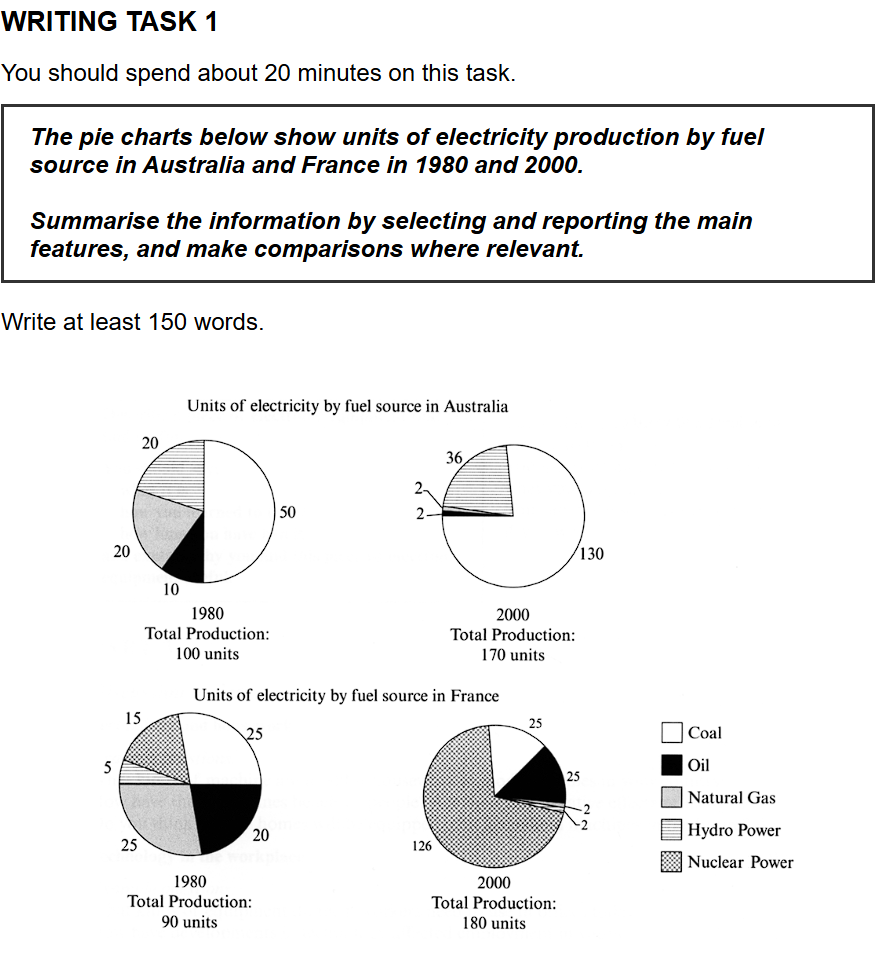 A comparison of units of electricity production by fuel source in Australia and France for two different years, 1980 and 2000, is presented in the provided pie charts. | The provided pie charts illustrate the units of electricity generated from various fuel sources in Australia and France in 1980 and 2000. | 分析与建议: 原句语法正确,但略显冗长。修改后的句子更简洁、更主动。”illustrate” 是图表题的常用高分动词。”generated from” 比 “production by” 更地道。 |